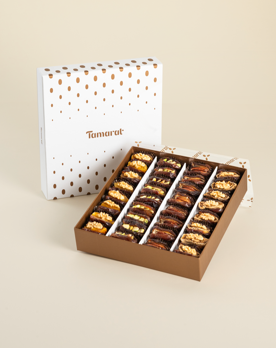 Experience the perfect blend of sweetness in our Signature Box, featuring dates filled with either figs and walnuts or apricot and pistachio.